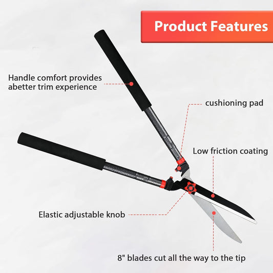 Garden Hedge Shears, Lightweight 29 Inch Steel Manual Hedge Clippers for Trimming Borders, Boxwood, and Tall Bushes, Ergonomic Handle with 10" Rust and Stick Proof Sharp Blade with Limb Notch